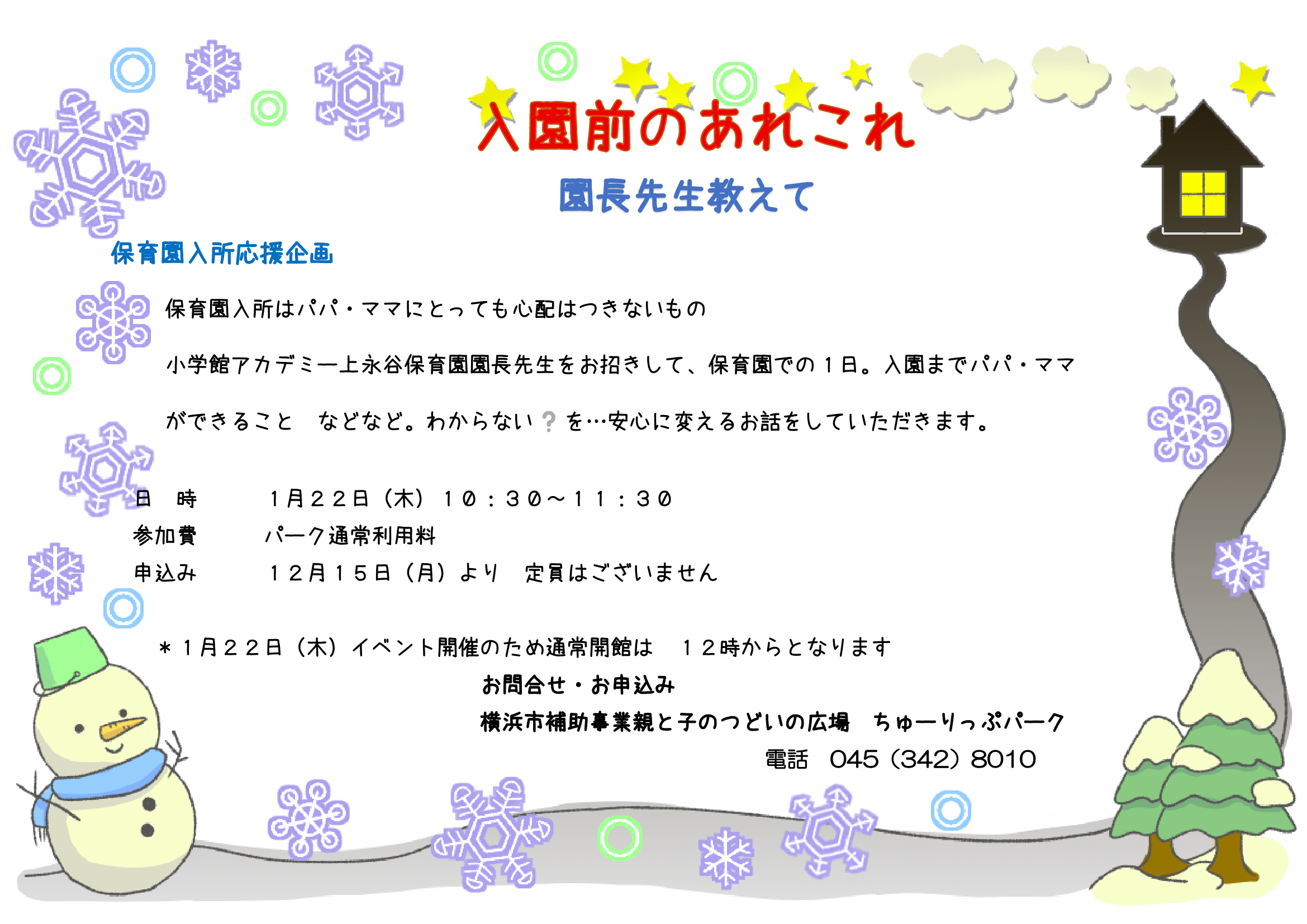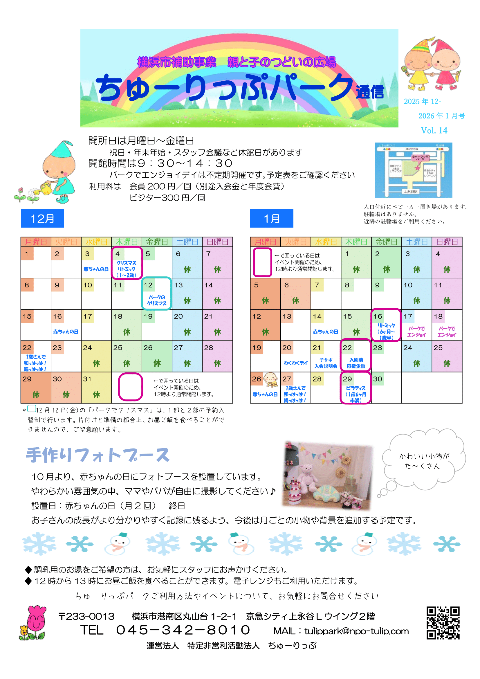 | 利用方法 | ひろば利用には予約は不要です。 開館中はいつでもお立ち寄りください。 (イベント等で予約制の場合があります) ★会員になると利用料の割引や特典があります。 ちゅーりっぷサポートメンバー(会員) 入会金 1,000円、年度会費 1,000円 「ちゅーりっぷカフェ」にも会員扱いでご利用できます。 |